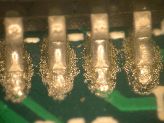 錫球大多數發生在PCB零件面,由于PCB過錫時未干的助焊劑揮發,或者空氣中水汽太多,當這些水分接觸到高溫的熔錫時,氣體大量膨脹,造成錫的爆發,錫就被噴涌而出形成錫球。